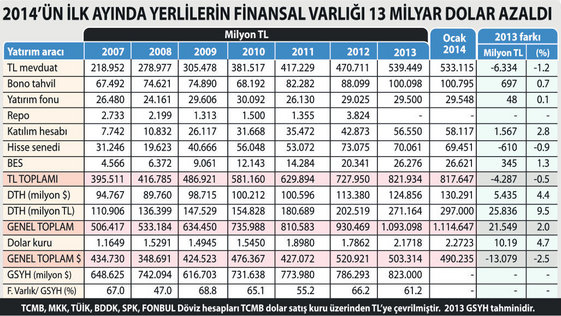 Bu küçük çaplı devalüasyon ve gelişmeler dengeleri yerinden oynattı, yerlilerin dövize yönelmesine yol açtı. Yukarıda yer alan tablodan izlenebileceği gibi, yerlilerin döviz mevduatı ocakta 5.5 milyar dolar birden sıçradı ve 124.8 milyar dolardan 130.3 milyar dolara çıktı. Döviz mevduatındaki artış yüzde 4.4 ü bulurken bu hesapların TL karşılığı ise yüzde 9.5 büyüdü. Çünkü ocak ayında TL değer kaybetti. Buna paralel olarak TL mevduatlarda 6.3 milyar lira azalma meydana geldi. Bu azalmada yıl sonu bilanço etkisi de olabilir ama yerlilerin TL mevduatları azaltırken döviz mevduatına bir miktar geçiş yaptıkları da kesin. Bu nedenle TL varlıklar azalırken finansal varlıklar içinde kayda değer tek artış döviz hesaplarında yaşandı. Yerlilerin toplam finansal varlığı kur artışının etkisiyle 13 milyar dolar azaldı.
