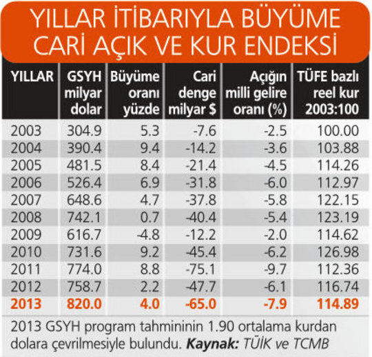 ■ 2011'de 75.1 milyar dolarlık rekor cari açık milli gelirin yüzde 9.7'sine ulaşmıştı. 2013'teki 65 milyar dolar 820 milyar dolar beklenen milli gelirin yüzde 7.9'una çıktı.