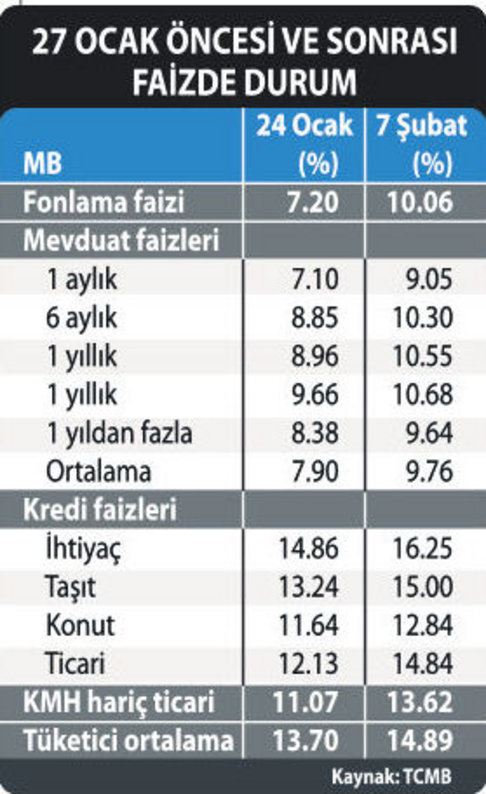 YÜKÜ YERLİLERE: Merkez Bankası yaptığı bir faiz artırımı ile işleri toparladı. Bankaları yüzde 7.20 ortalama faizle fonlarken yüzde 10 ve üzerinde bir faizle fonlamaya başladı. Bunun etkisi de mevduat ve kredi faizleri üzerinde ortaya çıktı. Merkez Bankası'nın verilerine göre 24 Ocak (27 Ocak öncesi durumu yansıtıyor) ve 7 Şubat'taki faizlerin düzeyi ve aradaki fark ekonomiye ve vatandaşa maliyeti gösteriyor.