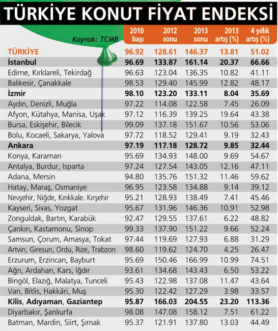■ İstanbul da 4 yılda yüzde 66.7 lik iyi bir artış var. Fakat balon olması için artışın son 5 yılda kendini katlaması, yani yüzde 100'ü bulması gerekir. Bu teoriyi geliştiren Case Shiller Endeksi'nin yaratıcısı Robert Shiller. Buna göre 2014'te yüzde 30'u bulan fiyat artışları yaşanmazsa, konutta balon riski azalacak.