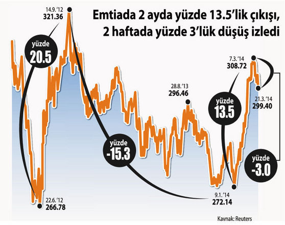 Bir yandan jeopolitik risklerin ortaya çıkması öte yandan Çin ekonomisine yönelik belirsizliklerin artması altını ve emtialara farklı etkileyebilir. Çin in ekonomisinin yavaşlıyor olması emtianın en büyük alıcısının talebini azaltması demek. Bunun da emtia fiyatlarına kısmen yansımaya başladığını görüyoruz. 9 Ocak - 7 Mart arasında iki ayda yüzde 1 3.5 prim yapan CRB Endeksi son iki haftadır yüzde 3 değer kaybetti. Emtianın bu yükselişi 2012 ortasındaki çıkıştan sonraki en güçlüsüydü. Kendisi de bir emtia olan altında ise durum daha karmaşık. Altın, yılbaşından 17Mart'a kadar 2.5 ayda yüzde 17.5 prim yaptı. Son 4 günde ise yüzde 4 değer kaybetti. 4 günün ilk iki günü kâr realizasyonu olsa da, son iki günü FED'in etkisinden. Parasal genişlemenin azaltılması ve sonlandırılması netleşti. Bu sonbaharda bitecek. 6 ay sonra da faiz artırımı başlayacak. Bu süreç doların değer kazanacağı bir süreç demek. Doların değerlenmesi bizzat altını aşağıya baskılayan bir olgu. Hem rakip hem de altının fiyatlaması dolar üzerinden. Normal koşullar altını güçlü bir yükselişe yöneltmez. Ancak Çin ekonomisinin kötüye gitmesi ve jeopolitik risklerin artması gibi durumlar hariç.