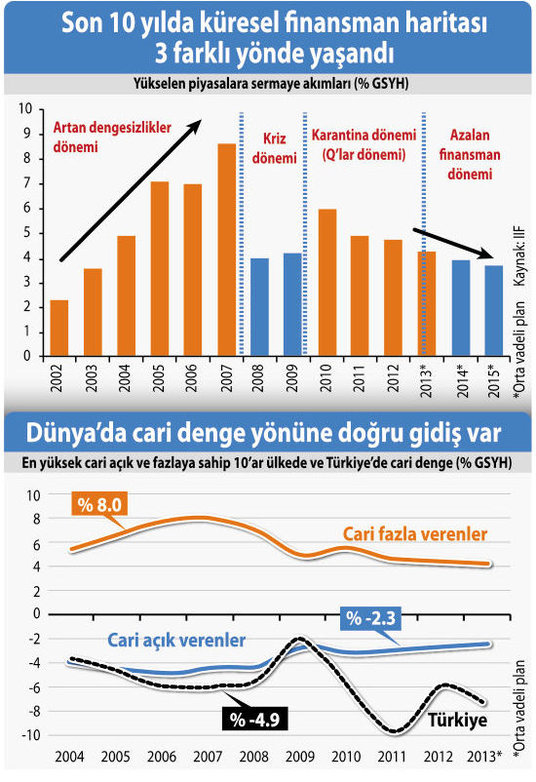 “1- Dünyanın finans haritası değişiyor. Son 10 yılda 3 farklı dönem yaşandı. Şimdi azalan finansman dönemindeyiz. Para, eskisi gibi kıymetli ve değerli hale geliyor. En çok cari açık veren 10 ülke ile fazla veren 10 ülke farkı yüzde 13.9 iken yüzde 6.6’ya indi. Küresel piyasalarda dengesizlik azaldı.