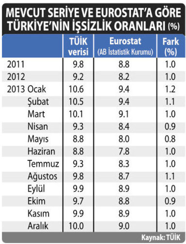 AZALACAK DEMEK YANLIŞ: İstihdam verilerinin Avrupa istatistik kurumu Eurostat'ın normlarına uyumlaştırılması halinde işsizlik oranları bitişikte görüldüğü gibi, geçmişe yönelik olarak yaklaşık 1 puan düşüyor. TÜİK Başkanı Birol Aydemir, bu durumla ilgili olarak "Oran 1 puan azalacak demek yanlış olur. Eski veriye göre bazı dönemlerde artış, bazı önemlerde düşüş olabilir. Yeni yöntem istihdam verilerine sadece daha iyi bir yaklaşım imkânı veriyor" dedi.