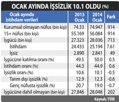 Dün açıklanan ocak ayı işsizlik oranı yüzde 10.1, işsiz sayısı 2.841 oldu. Geçen yılın aynı dönemine göre işsizlik yarım puan düşerken 761 bin istihdam yaratıldı. Buna karşılık iş aramayan ama çalışmaya hazır 2.083 bin kişi bulunuyor.