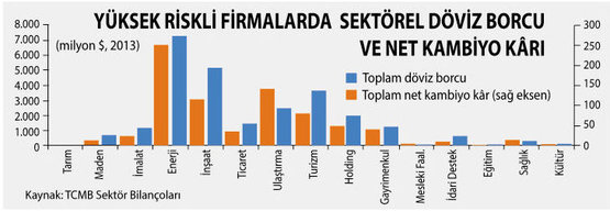 ■ Türkiye’de reel sektör şirketlerinin yabancı para borçları yabancı para varlıklarından daha yüksek. Bu şirketlerin dövizdeki pozisyon açığı Ocak 2014’te 173 milyar dolardır.