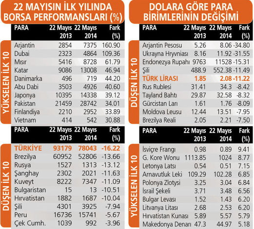 ■ 22 Mayıs'ın birinci yılında en olumsuz etkilenen piyasa iseTürkiye.Son dönemdeki pozitif ayrışmayarağ men bir yıllık dönemde İstanbul Borsası yüzde 16.5'lik kayıpl a dünyaborsalarıarasında en sonuncu sırada yer alıyor. BİST kendi içinde de ayrışıyor. Sanayi hisselerinde yaşanan kayıplar yüzde 5.5'de kalırken banka hisseleri yüzde 25 düştü.