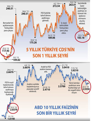 ■ Türkiye'nin dünya piyasalarından negatif ayrışmasını 5 yıllık CDS'lerin değeri de ortaya koyuyor. Türkiye CDS ile ABD 10 yıllık faiz oranları paralel hareket ederken, yani ABD'de yükselen faizler Türkiye riskini artırırken, son aylarda kkrışmanın olduaudikkat çekiyor. Türkiye risk primi ABD faizinden daha hızlı düşüyor.CDSprimiso n bir yılda düşmüş ama asıl artışı geçen yıl 22 Mayıs gelinceye kadar yaşamış ve 107'den 240'a çıkmıştı.