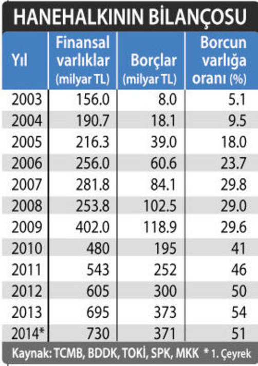 ■ Hatta buna karşı önlem hükümetten geldi. Borçlanarak tüketim yapılmasın, lüks tüketim kısılsın veya ithalata dayalı tüketim olmasın diye kredi kartına sınırlama, faizlere farklılaştırma getirildi. Bitişikte hanehalkının 2003’ten bu yana finansal varlıkları yani finansal sistem içindeki servetleri ile fnansal yükümlülükleri yani borçları yer alıyor. 2003 yılında hanehalhkının 156 milyar liralık servetine karşılık 8 milyar liralık borcu bulunuyordu. 2013 sonunda 730 milyar liralık varlığa karşılık 371 milyar liralık borçları oluştu. Borcun varlığa oranı yüzde 5’ten 54’e çıktı. 10 kat artış kaydetti. Bu çok kısa zamanda çok hızlı bir artışı ifade ediyor. Türkiye insanı tüketime aç, en ufak uygun ortamı buldu mu dur durak bilmiyor.