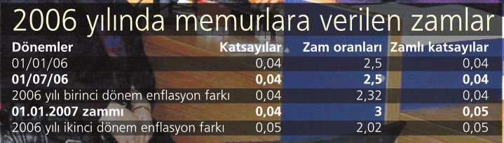 Tablolardan görüleceği üzere 2006 için memurlara sırasıyla yüzde 2.5, yüzde 2.5, yüzde 2.32 ve yüzde 2.02 zam verilmiştir. (Not: Yüzde 3 olan 2007 yılı Ocak normal zammı dikkate alınmamıştır. SSK ve Bağ-Kur emeklilerine ise yüzde 3, yüzde 3 ve yüzde 1.33 zam verilmiştir. Yani, yasaya uyulmamış ve SSK ile Bağ-Kur emeklilerine eksik zam yapılmıştır. Bunun telafisi de zammı eksik uygulayan AK Parti hükümetine düşer. AK Parti seçime kadar bu haklı zam farklarını vermezse bunu telafi etmek seçimden sonra iktidara gelmeyi uman muhalefet partilerine düşer. Bu zam farkı verilmezse 8 milyon emekli zamlarını söke söke mahkeme yoluyla alır.
