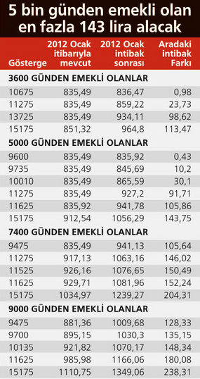 2000 öncesi emekli olmuş 1 milyon 940 bin emekli-dul ve yetime toplam 2 milyar 400 milyon yıllık maliyetli intibak zammı 2013 Ocak veya Temmuz ayında verilecek... Rakamı sayıya böldüğümüzde ortalaması 100 lira ama kimisi 0, kimisi 10 lira en yükseği de 310 lira zamlı intibak zammı alacak Esasen tüm SSK ve Bağ-Kur emeklilerinin intibak sorunu varken sadece 2000 yılı öncesi SSK emeklilerinden bir kısmına intibak uygulanacak. 2000 ve sonrası SSK emeklilerine intibak yok, Bağ-Kur emeklilerine ise hiç yok. 1999 yılı ve öncesinde emekli olmuşlara 2000, 2001, 2002, 2003, 2004, 2005, 2006, 2007 yıllarının Gayri Safi Milli Hasıla Artış Oranı (GSMHAO) Bakanlar Kurulu'nun seçtiği alternatif artışlardan birisi kadar artırılacaktır.