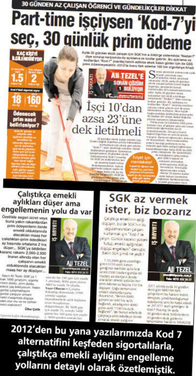 Sosyal Güvenlik Kurumu, ortada herhangi bir yasa değişikliği olmadığı halde daha önce çeşitli genelgeler ve en son 2013/11 sayılı genelge ile yaptığı düzenlemeden sonra SSK ve Bağ-Kur çakışmasında 2014/5 sayılı genelge ile yeni bir düzenleme yaptı... Vergi mükellefi ve şirket ortağı olanlardan kısmi süreli SSK’lı çalışanların, 30 günden eksik süreleri için Bağ-Kur zorunluluğu getirildi. Bu sigortalılar, gündelikçi ve öğrenciler gibi 30 günden az çalışan kesimle birlikte Kod 7 denilen puantajı seçtikleri takdirde eksik kalan günler için Genel Sağlık Sigortası primi ödemekten kurtuluyordu. Şimdi bu alternatifi kullananların da önü kesilmiş oldu. Hepsi eksik kalan günler için de Bağ-Kur’lu olmak zorundalar. Bu alternatif nedeniyle Kod 7’yi seçen sigortalı sayısı 2012’de 18 binken 2013’te 160 bine fırlamıştı.