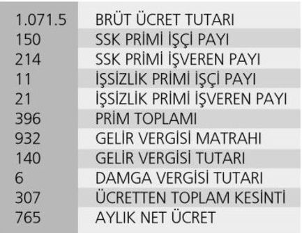Normal şartlarda asgari ücrete göre 1071.50 lira ile çalışan birisi için SGK’ya ödenecek prim ve vergiler aşağıdaki gibidir. Ancak hiçbir teşvikten yararlanmasanız bile yüzde 5 işveren prim indirim teşviki, genç kadın teşviki ve asgari geçim indirimi gibi indirimler dikkate alındığından cebinizden çıkacak rakam 280 lira gibi olur.