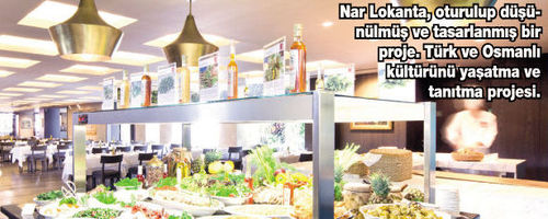 SON zamanlarda beni çok heyecanlandıran restoranlardan biri Nar Lokanta. Türk ve Osmanlı mutfağını şık bir ortamda misafirlerine sunan bir mekân. Mönü, geleneksel yemeklerimiz konusunda uzman bir isim olan Vedat Başaran’ın elinden çıkma. Nar Lokanta’da soğuk mezeler, ana yemekler ve tatlılar için ayrı büfeler bulunuyor. Mevsiminde, sezonluk olarak bulunabilen ürünleri kullanmaya dikkat ediyorlar. Bu sebeple mönüde yer alan bazı meze ve yemekler değişkenlik gösterebiliyor.