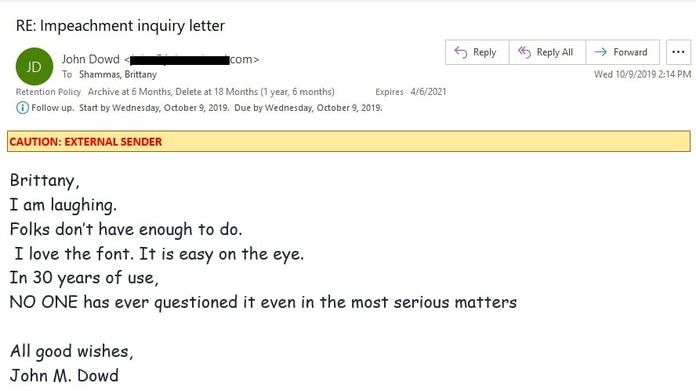 ABD seçimlerinde Rusya parmağıyla ilgili Muller soruşturmasında Trump’ın da avukatı olan Dowd ise verdiği yanıtta talebi reddediyor, Demokrat komite üyelerinin müvekkillerini taciz edip küçük düşürmeyi amaçladığını iddia ediyordu. Bu ciddi içeriğin Comic Sans karakterli bir mektupla iletilmesi ise büyük hayret uyandırıyordu. Doğal olarak sosyal medyada bir alay rüzgarıdır başladı. Çocukların doğumgünü kartına yakışır neşeli karakterle yazdığı için Dowd’un barodan atılmasını isteyenler bile çıktı şakayla karışık. “Bu karakterle otel odasının kapısına ‘Do not disturb’ levhası assan bile kimse takmaz, nerede kaldı ki Kongre…” diyorlardı.