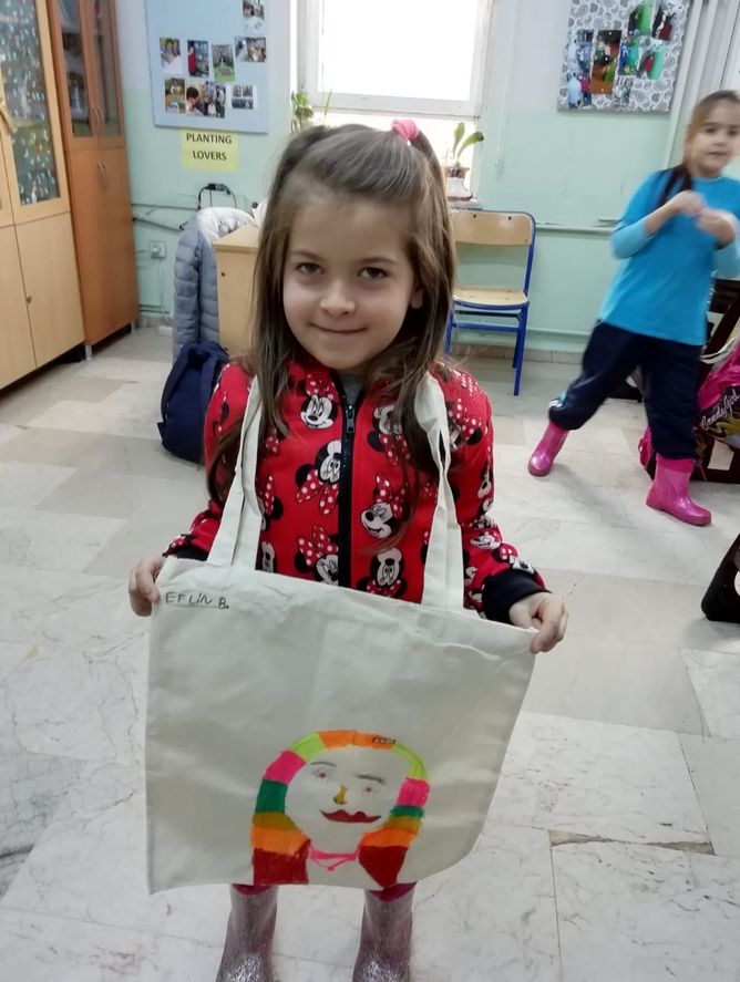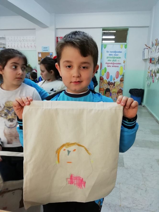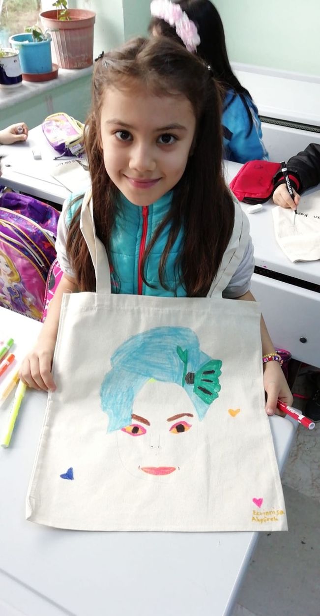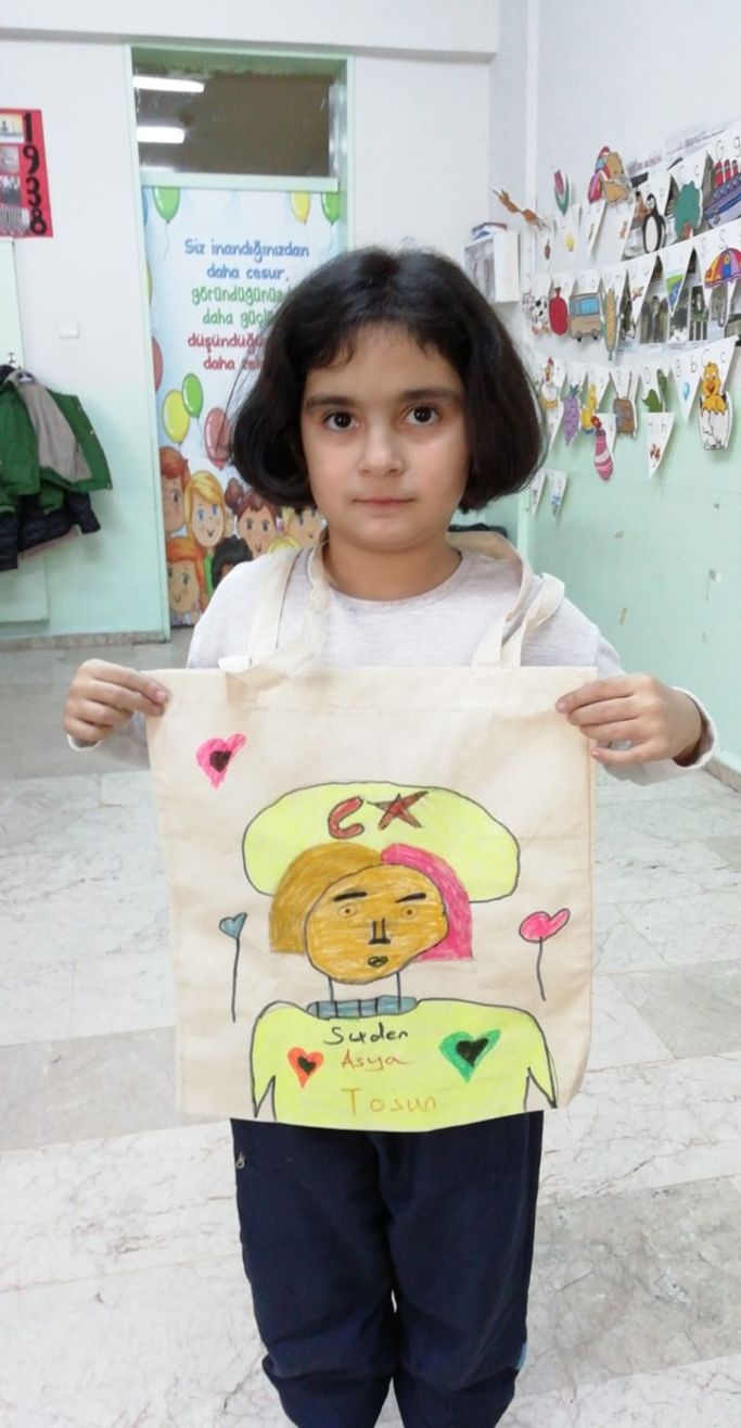 Yani Esra, kendi çabası ve gayretiyle bez poşetleri yaptırmış. Boya kalemleri gibi malzemeleri almış ve koymuş çocukların önüne.