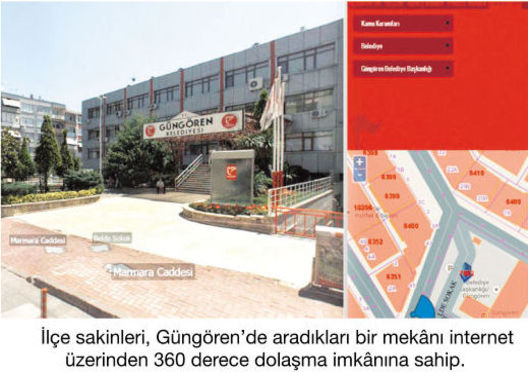 GÜNGÖREN Belediyesi, Akıllı İlçe Haritası uygulamasını hayata geçirdi. http://360derece.gungoren. bel.tr/ adresine giren ilçe sakinleri, Güngören’in tüm sokak ve caddelerini internet üzerinden 360 derece dolaşma imkânına sahip olacak. Bu uygulamayla okuldan hastaneye, spor tesislerinden bankaya, yeşil alan ve parklardan kamu binalarına kadar ilçenin tüm üstyapısı ve hatta altyapısı bir tık uzaklıkta...