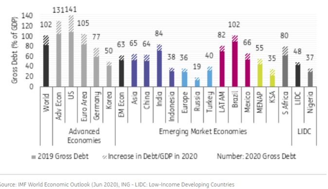 Kamu borcu bahsine gelince, pandemi sebebiyle hemen her ülkenin borcunun artacağını biliyoruz. IMF verileri ile küresel kamu borcu, 2019’da toplam dünya milli gelirinin %82,8’i kadar. Bir yıl içinde bu oran %101,5’e yükselecek. Gelişen ülkelerde bu oran 52’den 63’e çıkacak*.