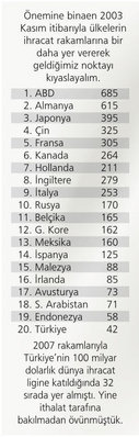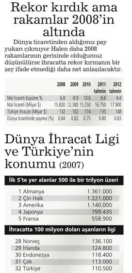 Rekor kırdık ama rakamlar 2008'in altında Dünya ticaretinden aldığımız pay yukarı çıkmıyor Halen daha 2008 rakamlarının gerisinde olduğumuz düşünülürse ihracatta rekor kırmanın bir şey ifade etmediği daha net anlaşılacaktır.