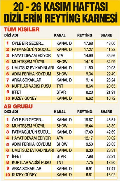 1976 yapımı, Robert De Niro’nun başrolünü oynadığı Taxi Driver filminden televizyona aktarılacak dizide Mehmet Ali Nuroğlu ile İtalyan aktris Lavinia Longhi rol alacak. Dizi, Türkiye’ye tatile gelen ve fuhuş batağına sürüklenen iki İtalyan kadının öyküsünü ekrana yansıtacak. Yine Ezel’in ekibinden yönetmen Uluç Bayraktar, bu sezon da çok iddialı bir projeyle karşımızda olacak; Kod Adı 25. Berrak Tüzünataç Engin Altan Düzyatan ve Erkan Can’ın başrollerini oynayacağı, Berkun Oya’nın kaleme aldığı ve sadece 25 bölüm yayınlanacak dizi, son anda bir değişiklik olmazsa atv ekranında yayınlanacak. Çekimleri Urfa ve Ürdün’de gerçekleştirilecek polisiye yapım için halen oyuncu seçimleri devam ediyor. Dizinin, yeni yılın ilk ayında ekrana gelmesi bekleniyor. Bakalım bu birbirinden iddialı yapımların yayını için haftanın hangi günleri seçilecek. Bakalım bu dört ciddi rakibin de sahaya çıkmasıyla, ekran trafiği nasıl şekillenecek. Yakından takip etmeye devam edeceğiz. Hepinize iyi haftalar...