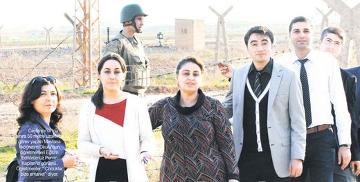 Müge Akbulut: (Mavi çizgili gömlekli) Şubat'ta atandım. Sınıf öğretmeniyim. Bursa'dan geldim. Hiç silah sesi duymamış, mermi görmemiştim. Hepimizi olumsuz etkiliyor. Ama öğrencilerimiz daha kötü durumda.