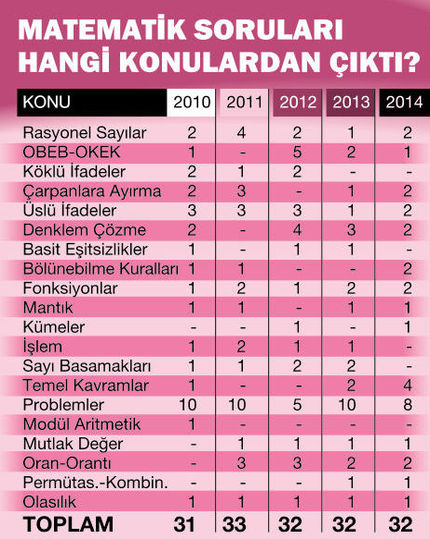 Yükseköğretime Geçiş Sınavı’nda (YGS) gençlerin en başarısız oldukları iki testten biri Fen Bilimleri diğeri de Temel Matematik Testi. Tüm testlerde olduğu gibi bu testte de size 40 soru yöneltilecek. Matematiksel ilişkilerden yararlanma ile ilgili bu soruların geçen yıl yapılma ortalaması tüm adaylar için 6.1, son sınıf öğrencileri için ise 6.5 oldu. Oysa 2013 yılında bu oran tüm adaylar için 7.5, son sınıf öğrencileri için 7.9 olmuştu.