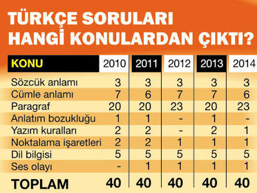 DÖRTTE ÜÇÜ ANLAM SORUSU: Soruların dörtte üçü yani yaklaşık 30-32’si anlam, geri kalanı da dilbilgisi ile ilgili oluyor. Anlam bilgisi soruları sözcük anlamı (3 soru), cümle anlamı (6 soru), paragraf (23 soru) olarak yöneltiliyor. Sözcük anlamı sorularında öğrenciden sözcüğün ve sözcük gruplarının cümle içindeki anlamını kavrayabilmesi, birtakım kavramları, deyim ve atasözlerini bilmesi isteniyor. Cümle anlamı sorularında cümle ile ilgili kavramları ayırt etmesi, yakın ya da karşıt anlamlı cümleleri, cümleden çıkacak anlamı bulması, cümleyi anlamca uygun biçimde tamamlaması bekleniyor. Paragraf sorularında paragraftaki konuyu, ana düşünceyi, yardımcı düşünceyi bulması, cümlelerden paragraf oluşturabilmesi ve paragrafı oluşturan cümlelerle yani paragrafın yapısıyla ilgili soru tiplerini çözebilmesi istenir.