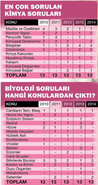 BİYOLOJİ: Soruların niteliği temel biyoloji bilgilerinin kavranması üzerine kurulu ve 9. sınıf ağırlıklıdır. Şekil, grafik ve tablo türünde çıkar, neden- sonuç ilişkisi vardır. Açık ve net değerlendirme yapılması istenir. Tanımlar karşılaştırmalı olarak sorulur, bazen deney üzerinden yorumlatılır. Deney ve grafikler matematiksel verilere dayanır. Verilerin yorumlanması ile cevaba kolaylıkla ulaşılabilir. Ama dikkatli olmalısınız. Soruların şekilleri değişse de içeriği yıllara göre aynıdır. Her yıl farklı biçimlerde sorulur. Soruların genelde olumlu sorulması, öğrencinin başarı oranını artırır ama birkaç soru “... hangisi değildir?” şeklinde yöneltilir. Yapılamayacak zor soru yoktur. Biyolojide başarısızlığın nedenlerinin başında zaman sorunu geliyor. Bu dersi zor ve ezbere dayalı görüyorlar. Soruları okurken acele etmemek gerekiyor çünkü sorulara verilen zaman yeterli.