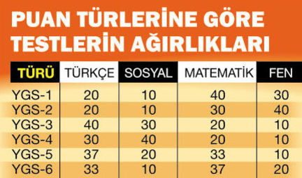 YGS’de Türkçe, Temel Matematik, Fen Bilimleri ve Sosyal Bilimler olmak üzere 4 tane test yer alıyor. Her testte 40’ar soru bulunuyor. YGS’de adayların yanıtlaması gereken soru sayısı 160. Sınavın 140 ve 180 olmak üzere iki tane baraj puanı var. Sınav sonucunda yapılacak hesaplamada adayların YGS’nin 6 puan türünden birinde bu puan barajlarını aşması gerekecek. Her puan türünde puanların en küçüğü 100, en büyüğü de 500 olarak hesaplanacak.