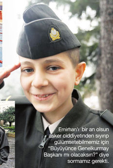 4 yıllık eğitim verilen askeri liselerin en küçük öğrencilerinden biri 2000 yılı doğumlu Emirhan Yılmaz. Askeri üniformayı henüz birkaç ay önce giyen Emirhan’a, Kuleli Askeri Lisesi’nin bahçesinde dolaşırken şans eseri rastladık. Sağ eliyle ‘sert’ bir selam çakarken, sol elinde Tarık Buğra’nın kitabını taşıyan sarışın mavi gözlü Emirhan’ı üniforma ciddiyeti içinde görüp de durdurmamak, aklından geçenleri öğrenmemek mümkün değildi. Onu bir an olsun asker ciddiyetinden sıyırıp gülümsetebilmemiz için “Büyüyünce Genelkurmay Başkanı mı olacaksın?” diye sormamız gerekti. Gururlu bir duruşla “Elbette isterim” diyen Emirhan, niçin asker olmak istediğini şöyle özetledi: “Orduluyum. Dayım uzman çavuş. Bu mesleği dayımdan görüp sevdim. Tek hedefim ülkeme en iyi şekilde hizmet edebilmek.”