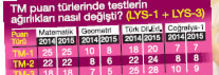 İşte bu hesaplama yapılırken geçen yıla göre testlerin puan türlerinin oluşmasına yapacağı ağırlıkları değişecek. TM-1, TM-2 ve TM-3 olmak üzere 3 farklı puan türünün hesaplanmasında YGS’nin testlerinin katkısı yine yüzde 40 olacak. Geçen yıla göre YGS içinde yer alan Türkçe, Sosyal Bilimler, Temel Matematik ve Fen Bilimleri testinin ağırlık yüzdeleri ayrı kalacak. Ancak işletme, maliye, uluslararası ticaret gibi TM-1 puanıyla öğrenci alan programlar için yapılan hesaplamada Matematik sorularının etkisi geçen yıl olduğu gibi yüzde 25 olacak. Geometri soruları yüzde 10 değil yüzde 8, Türk Dili ve Edebiyatı soruları yüzde 18 değil yüzde 20 etki yapacak. Coğrafya- 1’in etkisi yine eskisi gibi yüzde 7. Küresel siyaset ve uluslararası ilişkiler gibi TM-2 puanıyla öğrenci alan programlarda bu kez LYS’nin Matematik sorularının etkisi yine yüzde 22 ama geometrinin etkisi yüzde 8’den yüzde 6’ya düştü. Türk Dili ve Edebiyatı soruları ise yüzde 22 değil ama yüzde 24 etkili. Coğrafya-1 Testi’nin bu puan türüne etkisi yine yüzde 8. Psikoloji, sosyoloji gibi artık hukuk fakültelerinin de öğrencilerini seçerken kullanacağı TM-3 puanında Matematik sorularının etkisi yine yüzde 18. Ancak bu puan türünün oluşumunda Geometri’nin etkisi yüzde 7’den yüzde 5’e düştü. Türk Dili ve Edebiyatı sorularının etkisi ise yüzde 25’ten yüzde 28’e yükseldi. Coğrafya-1’in etkisi de yüzde 10’dan yüzde 9’a düştü.