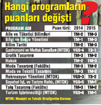 Bu yıl üniversite sınavlarına girecek gençlerin bazı programlarda yapılan puan değişikliklerini dikkate almaları gerekiyor. Tıpkı hukuk okumak isteyen gençlerde olduğu gibi onları puan değişiklikleri sürprizleri bekliyor. Dün de duyurduğumuz gibi Türkçe Matematik (TM) puan grubundan TM-2 ile öğrenci alan hukuk fakülteleri bu yıl TM-3 puan türünü kullanacak. Ancak puan türü değişen tek program hukuk değil. Bilim Tarihi, Gastronomi ve Mutfak Sanatları, Moda ile Grafik Tasarımı gibi birçok bölümde de puan değişikliği söz konusu. Sizler için hangi programlarda puan türlerinin değiştiğini çıkardık.