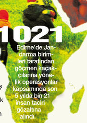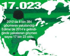 HER dönemde göçmen kaçakçılığı faaliyetlerine sahne olan Edirne’de trafik son 2 yılda katlanarak arttı. 2010 yılında 8 bin 384 göçmenin yakalandığı şehirde 2014’e gelindiğinde yakalanan göçmen sayısı 17 bin 23 olarak kayıtlara geçti. Suriye iç savaşının başladığı yıl olan 2011’de 19 bin 846 göçmenin yakalandığı Edirne’de son 5 yılda yakalanan toplam göçmen sayısı 77 bin 108 olarak kaydedildi. Yakalananların uyrukları, dünyanın dört bir yanından geldiklerini ortaya koyuyor. Suriye, Burma, Filistin, Eritre, Afganistan, Somali, Irak, Pakistan, Gürcistan, İran, Cezayir, Fas, Mali, Kongo, Fildişi Sahili, Gana ve Ruanda pasaportu taşıyorlar.