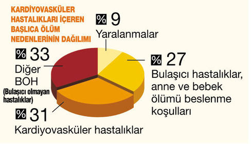 YAKIN zamanda dünyadaki, kalp hastalıklarına bağlı ölümlerin yüzde 80’inin gelişmiş ülkeler yerine az gelişmiş veya gelişmekte olan ülkelerde olacağına dikkat çekiliyor. Bu hastalıkların; Çin, Rusya ve Hindistan’daki artış hızları son derece korkutucu bulunuyor.