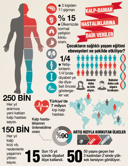 KALP - damar hastalıklarına yol açan nedenlere bakıldığında şişmanlık ve fazla kiloların göbek çevresinde birikmesinin ülkemizde giderek artan bir sorun olduğuna dikkat çekiliyor. Yapılan çalışmalar, 10 yıl önce 4 kişiden biri şişmanken günümüzde 3 kişiden 1’inin şişman olduğunu gösteriyor. Ülkemizde normal kilolu yetişkin oranının yüzde 15 olması sorunun büyüklüğüne dikkat çekiyor. Diyabetle ilgili yapılan araştırmaların da çarpıcı sonuçları bulunuyor. Son 10-15 yıl içinde diyabetin ikiye katlanması, yetişkinlerin dörtte birinde ya diyabet ya da diyabet öncesi göstergelerin olması, yine yetişkinlerin yarıya yakınında inmelerin baş nedeni olan yüksek tansiyon bulunması korkuyu artırıyor. 50 yaşını geçen her 3 kadından 2’sinde yüksek tansiyona rastlanmasıysa çözümlenmesi gereken önemli bir sorun olarak görülüyor.
