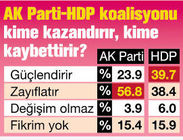 BİR başka koalisyon modeli olan AK Parti-HDP koalisyonunun kimi güçlendirip kimi zayıflatabileceği de seçmene soruldu. Ankete katılanların yüzde 56.8’i böyle bir koalisyonun AK Parti’yi zayıflatacağını dile getirirken, yüzde 23.9’u güçlendireceğini söyledi. Aynı soruya cevap verenlerin yüzde 39.7’siyse bu koalisyonun HDP’yi güçlendireceğini açıkladı. Zayıflatacağını söyleyenlerin sonucu da yüzde 38.4 çıktı.