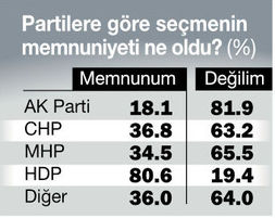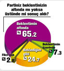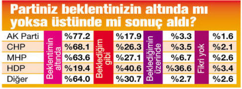 DÖRT partiye oy veren ve ankete katılanlar arasında 7 Haziran genel seçim sonucunun beklentisinin altında çıktığını söyleyenlerde AK Partili seçmenin oranı yüzde 77.2’yle ilk sırada yer aldı. Onu yüzde 68.1 ile CHP, yüzde 63.6’yla MHP seçmeni izledi. ‘Sonuç beklentimin altında çıktı’ diyen HDP’lilerse yüzde 19.4 oldu. ‘Beklentimin üzerinde oy aldı’ başlığındaysa ilk sırayı yüzde 36.6’yla HDP’li seçmen aldı.