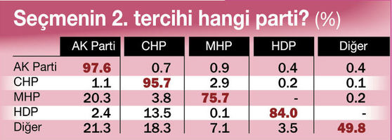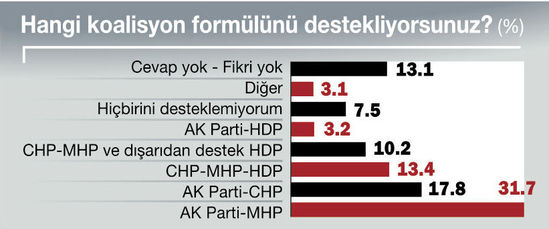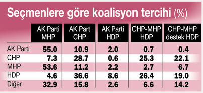 AK Partili seçmenin % 55’i MHP’yle kurulacak bir koalisyona destek veriyor. CHP’yle kurulacak koalisyona ise bu destek % 10.9 oranında. CHP’li seçmeninse % 28.7’si AK Parti’yle koalisyona ‘Evet’ diyor. İkinci olaraksa % 25.3 oranında CHP-MHP-HDP koalisyonunu istiyor. MHP’li seçmenin % 53.6’sı AK Partili koalisyona sıcak bakıyor. HDP’li seçmense % 36.6 oranında AK Parti-CHP koalisyonunu destekliyor.