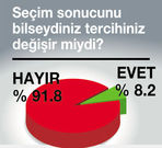 MEMNUNIYET oranının % 32.6 olduğu 7 Haziran Genel Seçimi sonrası seçmene, “Peki sonuçların böyle çıkacağını bilseydiniz parti tercihiniz değişir miydi?” diye de soruldu. Bu soruya ankete katılanların % 91.8’i “Hayır değişmezdi” cevabını verirken, % 8.2’si tercihinin değişebileceğini ifade etti.
