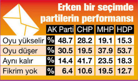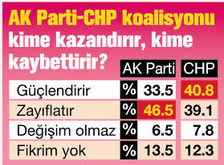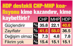 DIŞARIDAN HDP desteğiyle kurulabilecek CHPMHP koalisyonuna ilişkin de ilginç bir sonuç çıkıyor. Böyle bir koalisyonun CHP’yi zayıflatacağını belirtenlerin oranı yüzde 41.5’i bulurken, güçlendireceğini söyleyenler yüzde 35.8’de kalıyor. Aynı biçimde bu koalisyonun MHP’yi de zayıflatacağını düşünenlerin yüzdesi 58’e çıkarken, güçlendireceğine inananların yüzdesi 22.1. HDP cephesinden duruma bakıldığındaysa böyle bir koalisyonun HDP’yi güçlendireceğini düşünenler yüzde 40.6, zayıflatacağını düşünenler 36.5.