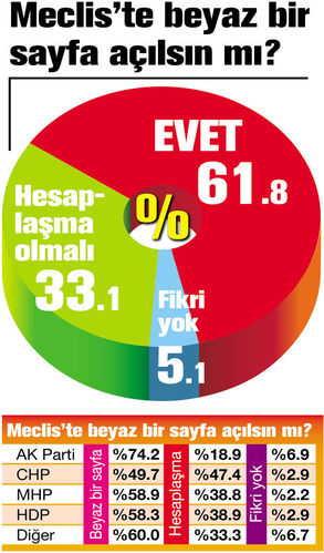 ANDY-AR araştırma şirketi seçmenlere 25. dönem milletvekili seçiminin ardından ortaya çıkan 4 partili Meclis’te, “Geçmişteki olaylar üzerinden hesaplaşma yapılsın mı, yoksa beyaz bir sayfa açılıp uzlaşma mı sağlansın?” diye sordu. Ankete katılanların yüzde 61.8’i, üçte ikiye yakını, ‘Meclis’te beyaz bir sayfa açılmalı’ dedi. Üçte bir oranında, yüzde 33.1’lik dilimse ‘Hesaplaşma olmalı’ yönünde fikir bildirdi. Ankete katılanların yüzde 5.1’iyse ‘Fikrinin olmadığını’ dile getirdi.