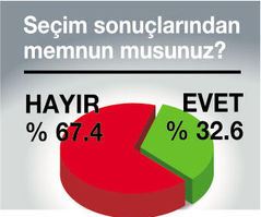 KAMUOYU araştırma şirketi ANDY-AR, seçimden 3 hafta sonra seçmene, “Seçim sonucundan memnun musunuz?” sorusunu yöneltti. Ankete katılanların yüzde 67.4’ü “Hayır, memnun değilim” yanıtını verirken, memnun olduğunu söyleyenlerin oranı % 32.6 çıktı.