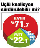 “SİZ, mevcut şarlarda AK Parti’nin içinde olmadığı bir koalisyon formülü, CHP-MHP-HDP koalisyonunun başarılı olabileceğine inanıyor musunuz?” sorusuna, yüzde 71.7 ‘Hayır’ yanıtını verirken, yüzde 22.1 ‘Evet’ diyor. Üçlü koalisyon için ‘Fikrim yok’ diyenlerse yüzde 6.2 düzeyinde.