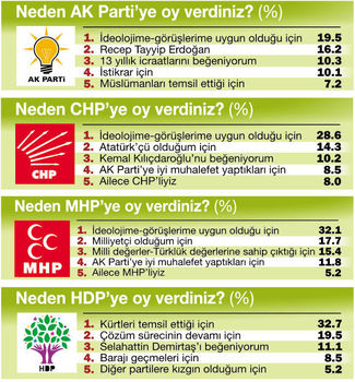 SEÇMENLERE, oy verdikleri partiyi tercih etmelerinin gerekçeleri de soruldu (Solda, ilk 5’er gerekçe var). AK Partili seçmenin ilk gerekçesi ‘İdeolojime ve siyasi görüşüme uygun olduğu için’ oldu. Seçmen ikinci neden olarak Cumhurbaşkanı Erdoğan’ı gösterdi. CHP’li seçmenin oy gerekçesinin ilk iki nedeni ‘İdeolojik yakınlık ve Atatürkçülük’tü. MHP’li seçmen oy gerekçesini ‘Siyasi bakışı yani ideolojisi ve milliyetçilik’ olarak açıklarken HDP’liler, “Kürtleri temsil ettiği için ve çözüm süreci” yanıtını verdi.