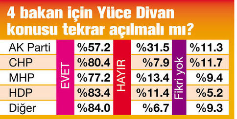 Yüce Divan meselesi seçmen için çok kritik. CHP, MHP ve HDP’nin kırmızı çizgilerinden. Bu üç parti için de olmazsa olmaz bir durum gibi ortada duruyor. Ancak 4 bakanla ilgili AK Parti seçmeninin de talebi büyük oranda aynı yönde.