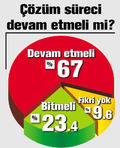 ARAŞTIRMADAN çıkan önemli bir sonuç da ‘Çözüm süreci’yle ilgili oldu. Ankete katılanların üçte ikisinden fazlası, yüzde 67’si ‘Çözüm süreci devam etmeli’ yanıtını verdi. Sürecin sonlandırılmasını isteyenlerin oranı yüzde 23.4’te kalırken, ‘Fikrim, cevabım yok’ diyenlerin yüzdesi 9.6 oldu.