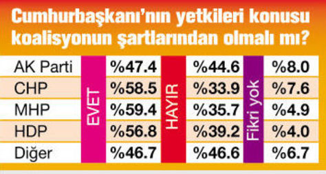 “CUMHURBAŞKANI’nın yetkileri, koalisyonun şartlarından biri olmalı mı?” sorusunu yanıtlayan seçmenlerin partilere göre dağılımında, MHP’li seçmen yüzde 59.4’lük ‘Evet’ yanıtıyla ilk sırada yer aldı. Onu, yüzde 58.5 ile CHP, yüzde 56.8’le de HDP izledi. Dördüncü sıradaysa yüzde 47.4 ile AK Partili seçmen yer aldı. Cuhmurbaşkanı’nın yetkilerinin koalisyon şartları arasında olmaması gerektiğini söyleyen AK Partili seçmenin oranıysa yüzde 44.6’yla ilk sırada yer aldı. AK Parti’yi, yüzde 39.2’yle HDP izledi. MHP’li seçmenin yanıtı yüzde 35.7 olurken, ‘Hayır’ cevabı veren en düşük oy oranı yüzde 33.9 ile CHP’li seçmenden geldi.