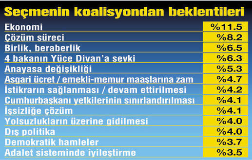 ANDY-AR’ın, ‘Kurulacak bir koalisyonun yapmasını istediğiniz temel icraatlar neler?’ sorusuna seçmenin verdiği ilk cevap ‘Ekonomik hamleler’ oldu. Bunu sırasıyla ‘Çözüm süreci devam etmeli’, ‘Birlik, beraberlik ve birleştirici olunmalı’ ve ‘17-25 Aralık’a ilişkin tekrar soruşturma yapılması gerektiği’ izledi. Seçmenin beşinci isteğiyse, Anayasa değişikliği oldu.