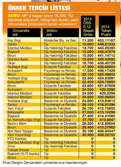 Final Dergisi Dershanesi Rehberlik Koordinatörü Celil Vardar, bu yıl asıl yarışın başarı sırası barajı getirilen hukuk ve tıp fakültelerini tercih edecek ilk 40 bin ve ilk 150 bin arasındaki adaylar arasında olacağını söylüyor. Vardar, “Bu yıl tıp ve hukuk puanları yükselir. Bir de formasyon hakkı verilmesiyle belli üniversitelerdeki temel bilim programları. Adaylar mutlaka kendi başarı sıralarını kullansınlar. Tercih listesini de 2-3 bin kişi yukarıdan fakat inebildikleri kadar aşağılardan seçecekleri programlarla oluştursunlar” diyor.
