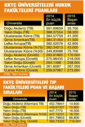 Tıp ve hukuk okumak isteyen öğrenciler eğer Türkiye’deki üniversitelerde başarı sırası barajına takılırsa KKTC üniversitelerini “barajsız” tercih edebilecek. Üstelik bu üniversiteler geçen yıl hukuk fakültelerinin ücretli programlarına başarı sıraları 170 bin ile 273 bin arasında değişen öğrenci aldı. Tıp fakültelerinde ise yine ücretli programlara 66 bin ile 110 bin başarı sırasındaki öğrenciler girdi. Öğrenim ücretlerine gelince; hukuk fakültelerinin ücretleri 16 bin ila 17 bin TL, tıp fakültelerinin öğrenim ücreti ise yaklaşık 37 bin TL.