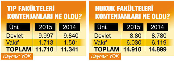 Bu yıl tıp fakültelerinin devlet ve vakıf üniversitelerindeki kontenjanları toplam 11 bin 710. Bu kontenjanın 9 bin 997’si devlet, 1713’ü vakıf üniversitelerinde. Hukuk fakültelerinde de toplam kontenjan 14 bin 910. Bunun 8 bin 880’i devlet üniversitelerinde.
